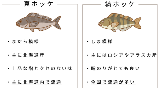 ホッケには「真ホッケ」「縞ホッケ」の2種類があり、多く流通しているのは「縞ホッケ」です。